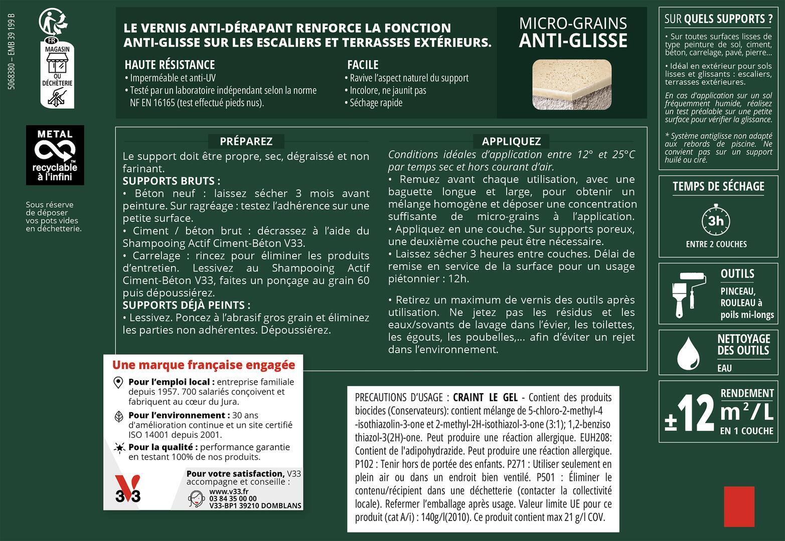 Le Vernis anti-dérapant V33 s'applique sur toutes surfaces lisses de type peinture de sols, ciment, béton, carrelage, pavé, pierre…