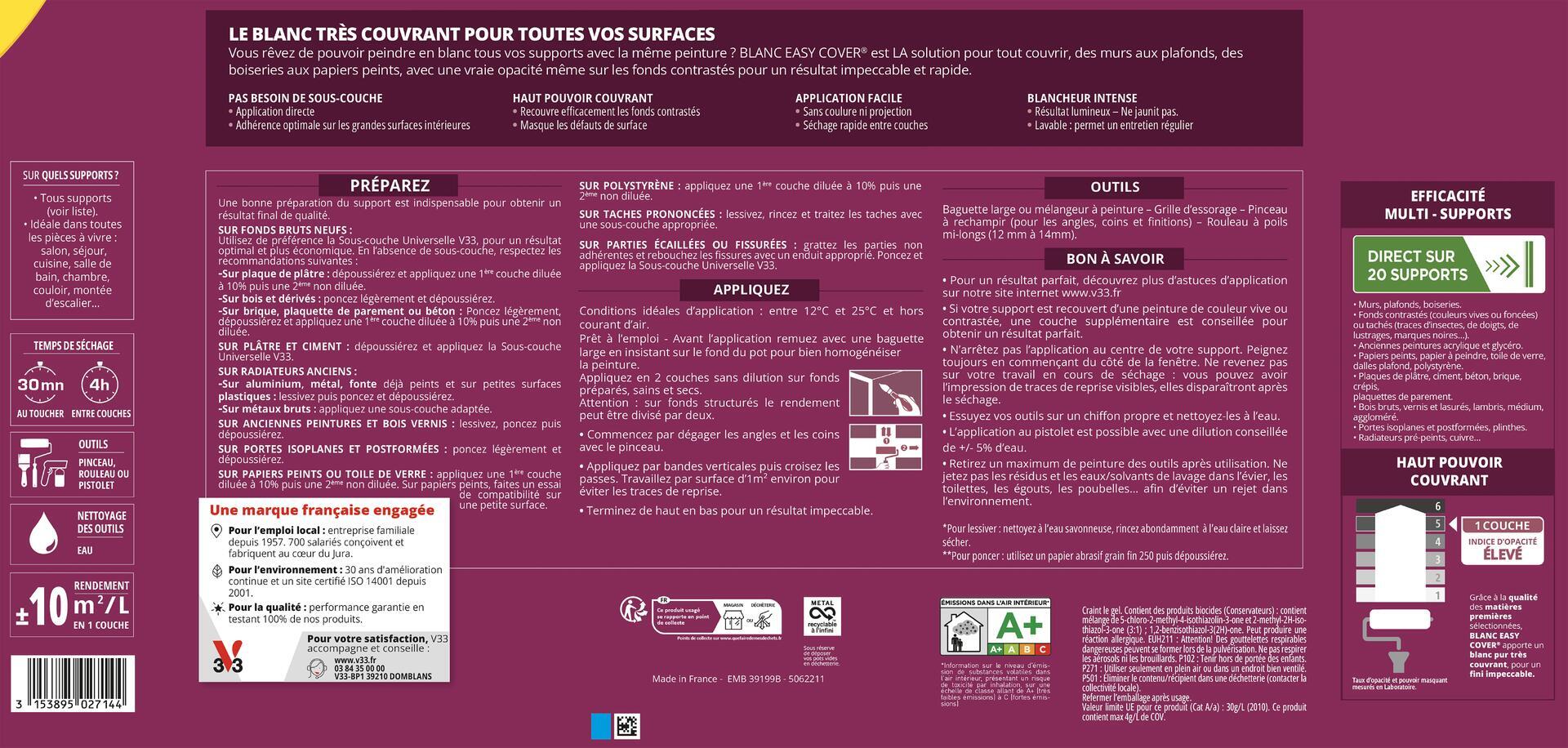 La peinture Blanc Easy Cover ® V33 convient pour les murs, plafonds et boiseries. Elle est idéale sur fonds contrastés (couleurs vives ou foncées) ou tachés (traces d’insectes, de doigts, de lustrages, marques noires…). Il est également possible de l'appliquer sur d'anciennes peintures acrylique et glycéro, sur papiers peints, papier à peindre, toile de verre, dalles plafond, polystyrène, plaques de plâtre, ciment, béton, brique, crépis, plaquettes de parement, bois (bruts, vernis et lasurés), lambris, médium, aggloméré, sur portes isoplanes et postformées, sur plinthes, et sur radiateurs (prépeints, cuivre…).