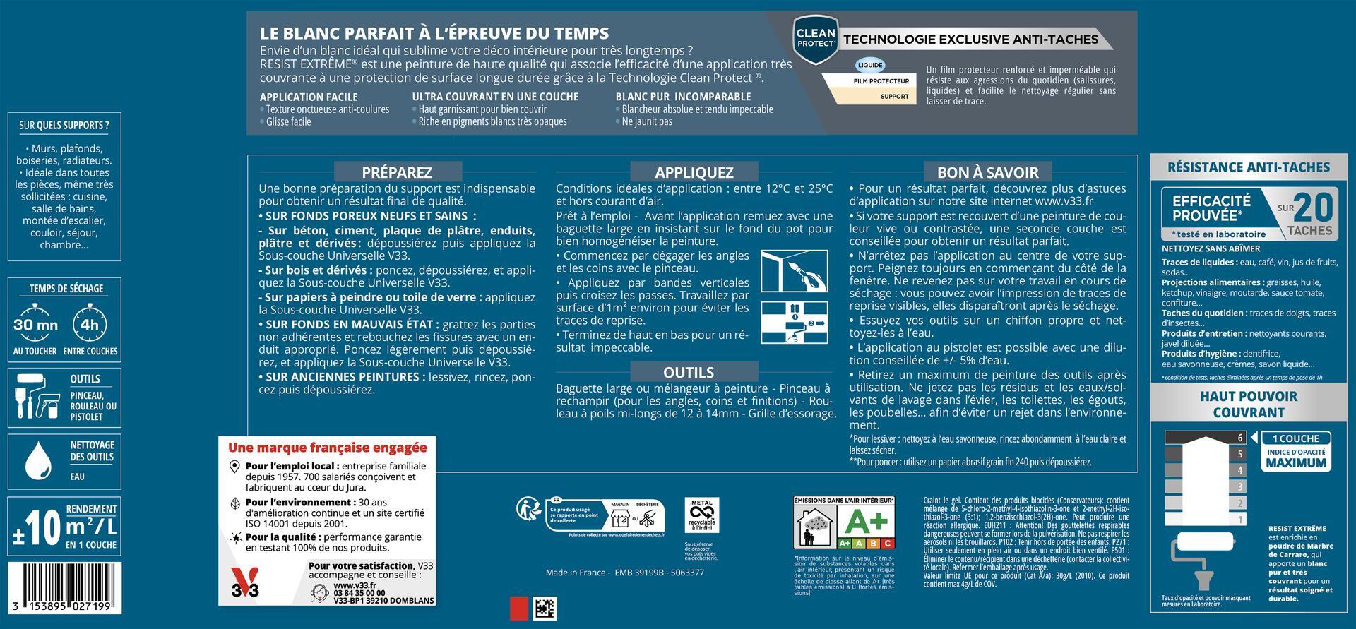 La peinture Blanc Resist Extrem ® V33 convient pour les murs, plafonds, boiseries et radiateurs.