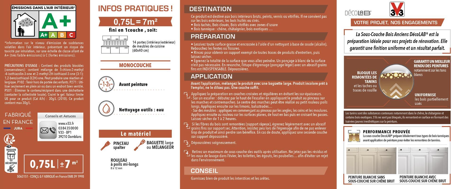 Parfaite pour vos meubles et escaliers en bois anciens, DécoLAB ® Sous-Couche Bois Anciens bloque les remontées de tanins et empêche ainsi la formation de taches ou les traces de rouille. DécoLAB ® Sous-Couche Bois Anciens de V33 garantit un me... Lire plus