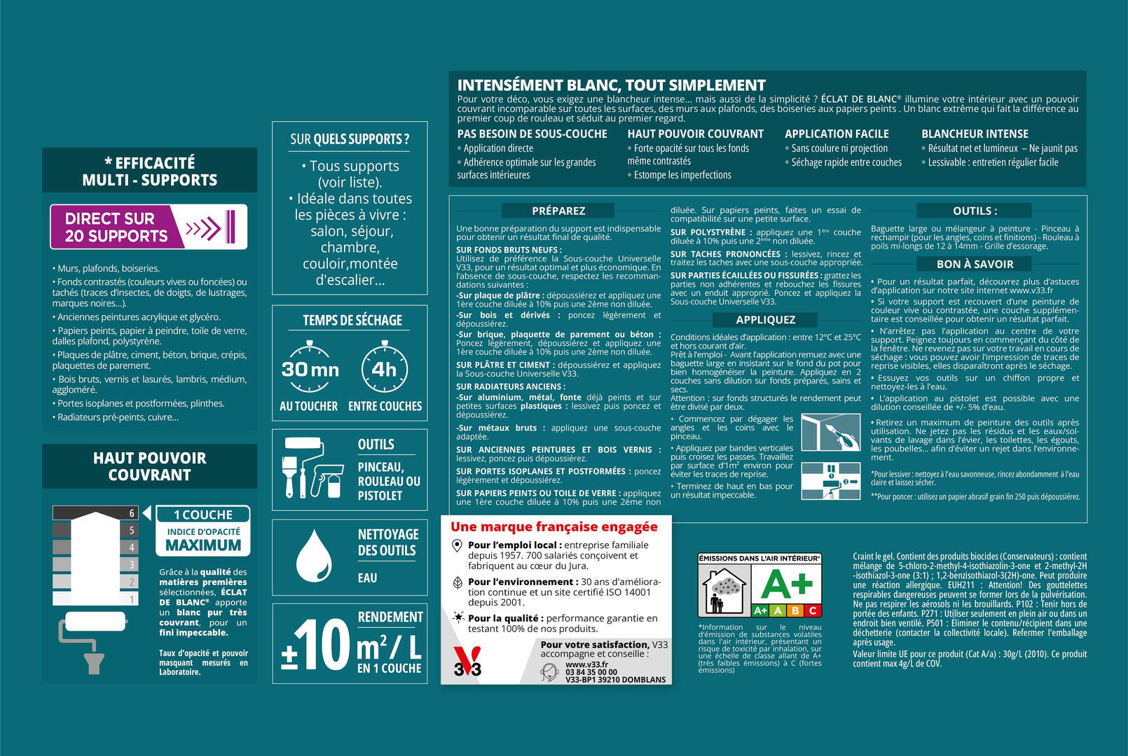 La peinture Éclat de Blanc ® V33 convient pour les murs, plafonds et boiseries. Elle est idéale sur fonds contrastés (couleurs vives ou foncées) ou tachés (traces d’insectes, de doigts, de lustrages, marques noires…).