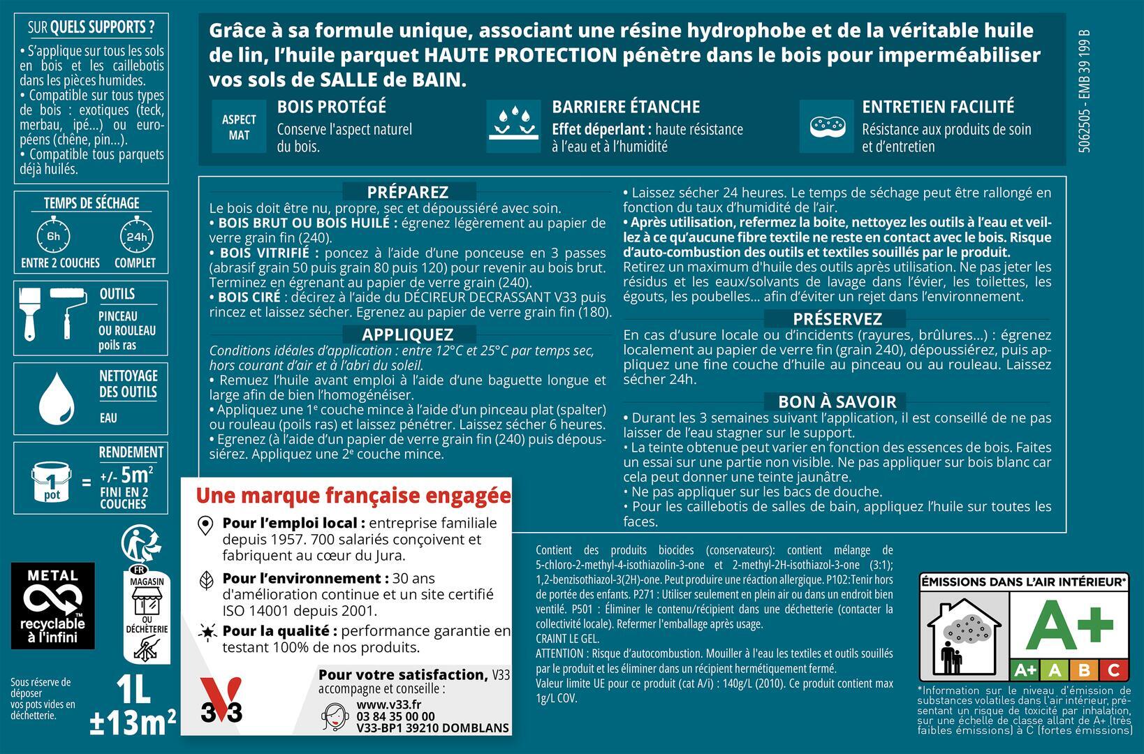 Envie de préserver votre parquet de l’eau et de l’humidité ? Grâce à sa formule unique, associant une résine hydrophobe et de la véritable huile de lin, l’huile parquet HAUTE PROTECTION V33 pénètre dans le bois pour imperméabiliser vos sols de SALLE de... Lire plus