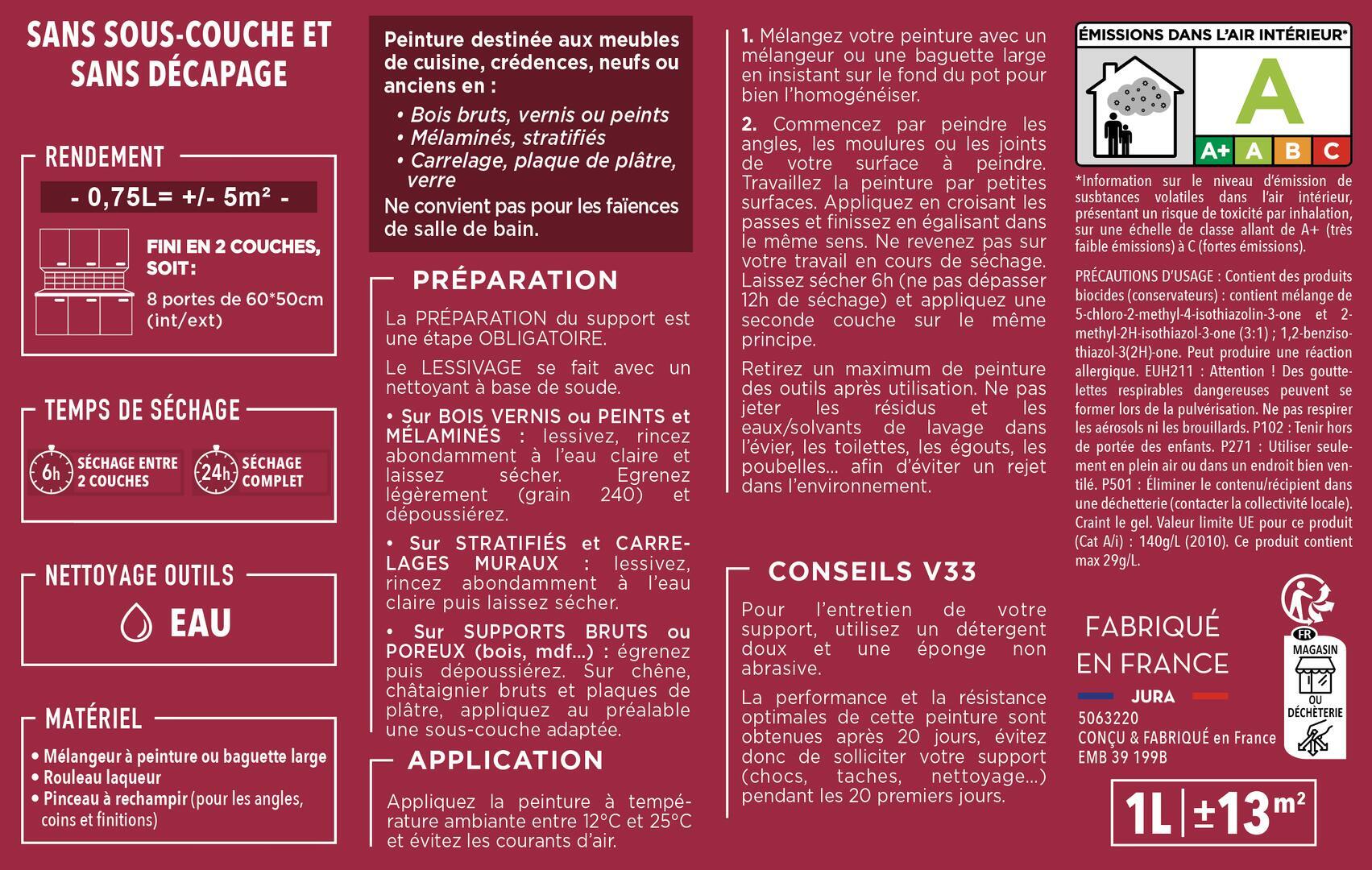 Cette peinture de rénovation V33 est destinée aux meubles de cuisine, crédences, neufs ou anciens en : - Bois bruts, vernis ou peints - Mélaminés, stratifiés - Carrelage, plaque de plâtre, verre. Ne convient pas pour les faïences de salle de bain.