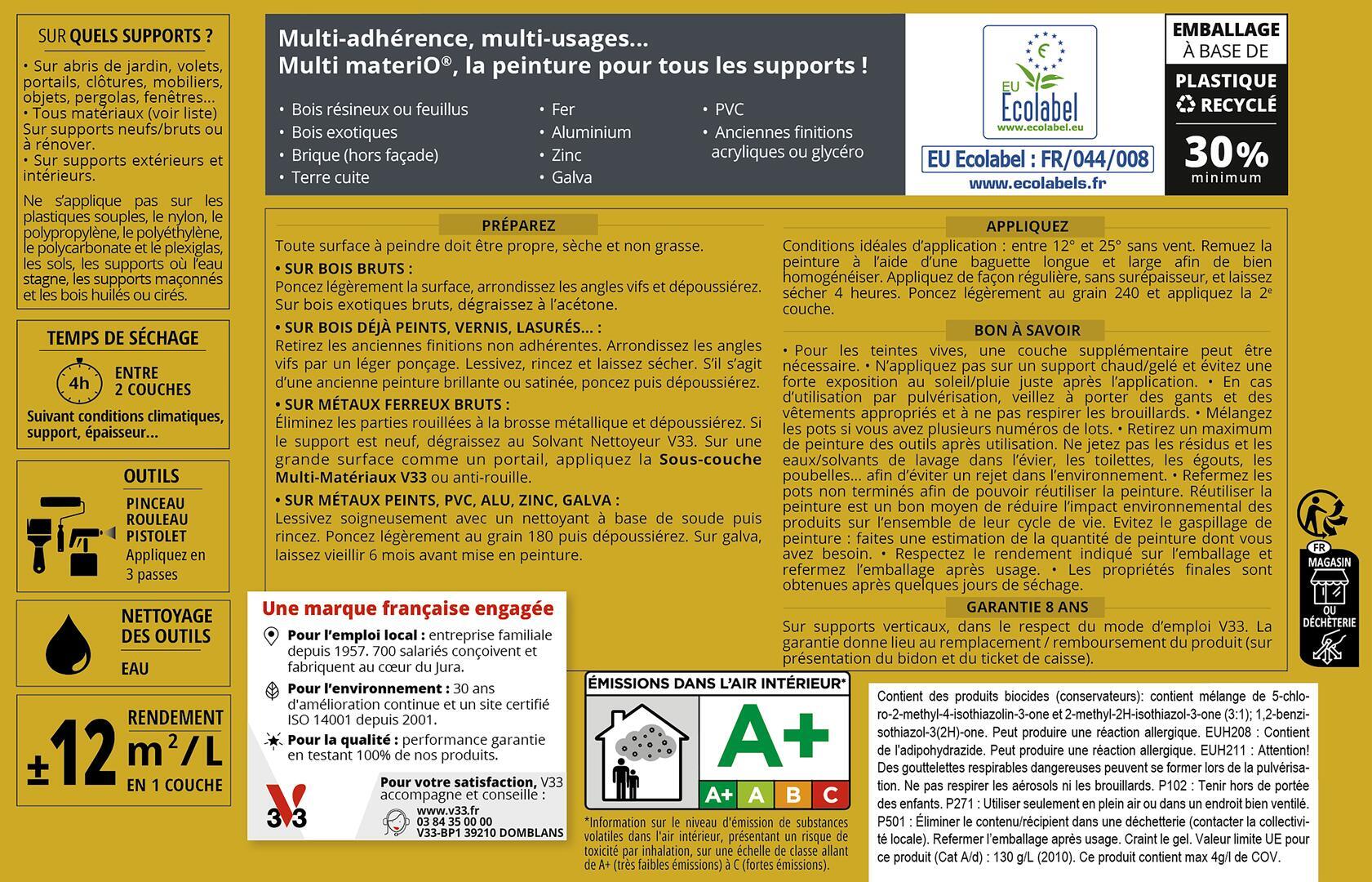 La Peinture Extérieure Multi materiO ® ne s’applique pas sur les plastiques souples, le nylon, le polypropylène, le polyéthylène, le polycarbonate et le plexiglas, les sols, les supports où l’eau stagne, les supports maçonnés et les bois huilés ou cirés.