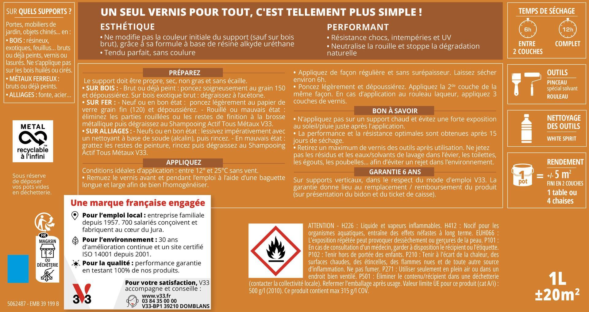 • Esthétique : Ne modifie pas la couleur initiale du support (sauf sur bois brut), grâce à sa formule à base de résine alkyde uréthane.