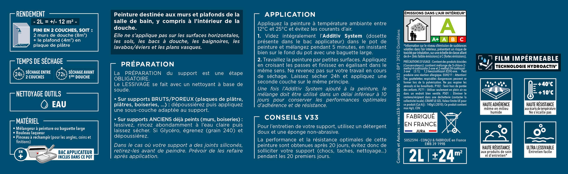 Cette peinture V33 est destinée aux murs et plafonds de la salle de bain, y compris à l’intérieur de la douche.