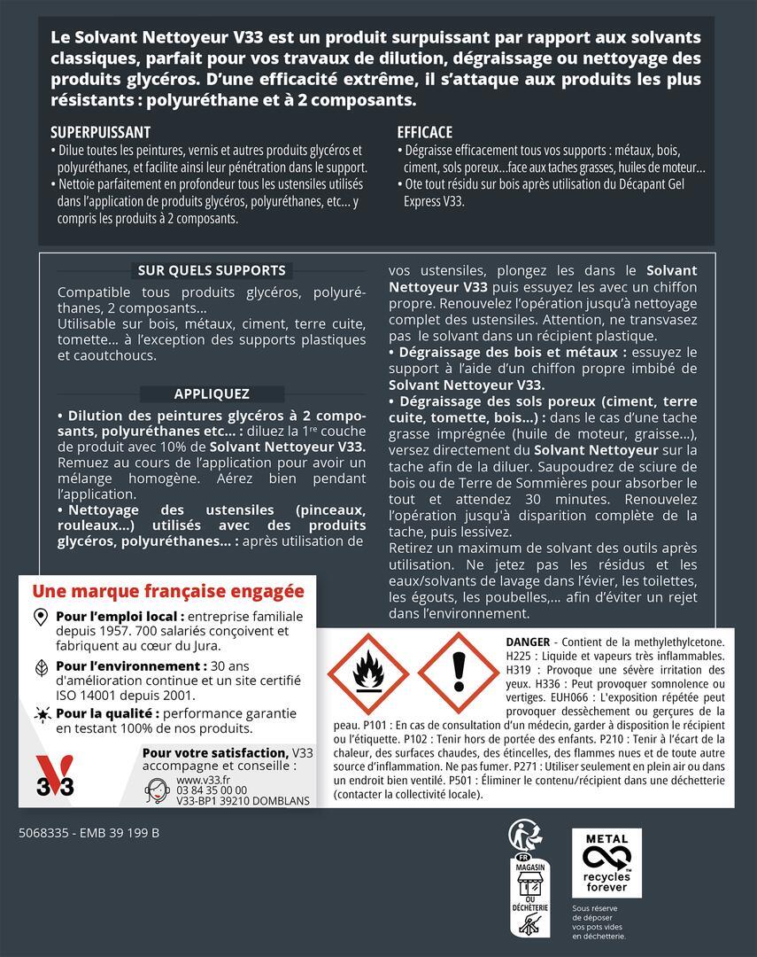 Le Solvant Nettoyeur V33 est utilisable sur bois, ciment, métaux, terre cuite, tomette… à l’exception des supports plastiques et caoutchoucs.