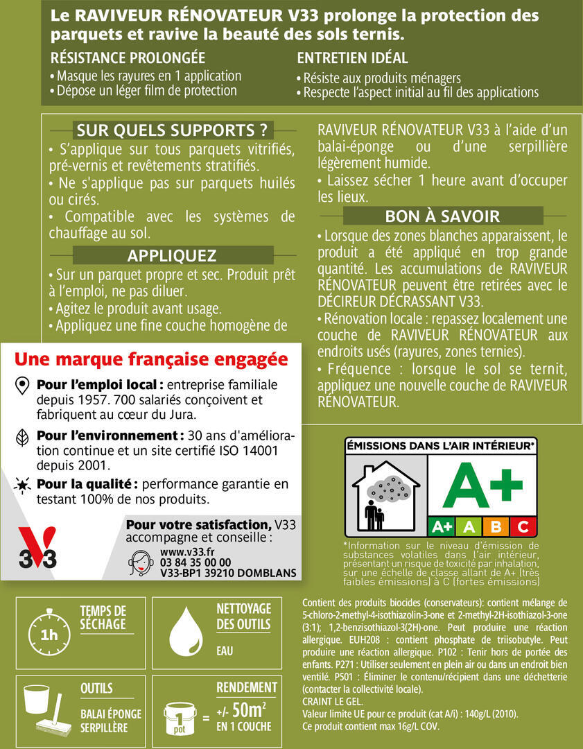 Appliquez une fine couche homogène de RAVIVEUR RÉNOVATEUR V33 à l’aide d’un balai éponge ou d’une serpillière légèrement humide