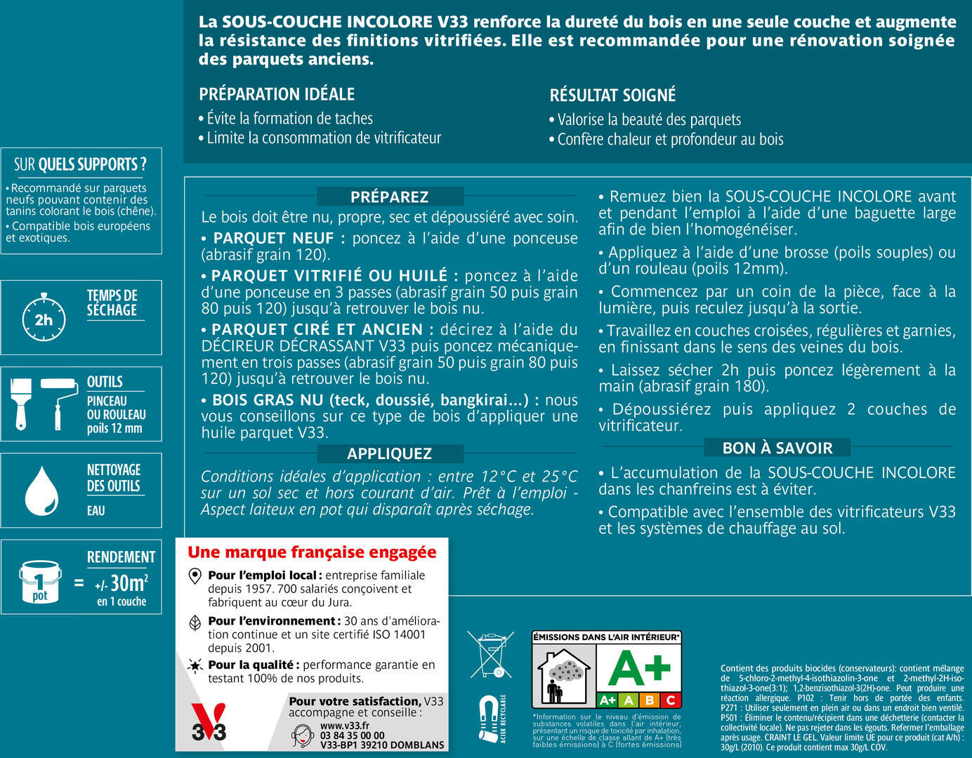 - La Sous-couche Incolore V33 est compatible avec l’ensemble des vitrificateurs V33 et les systèmes de chauffage au sol.