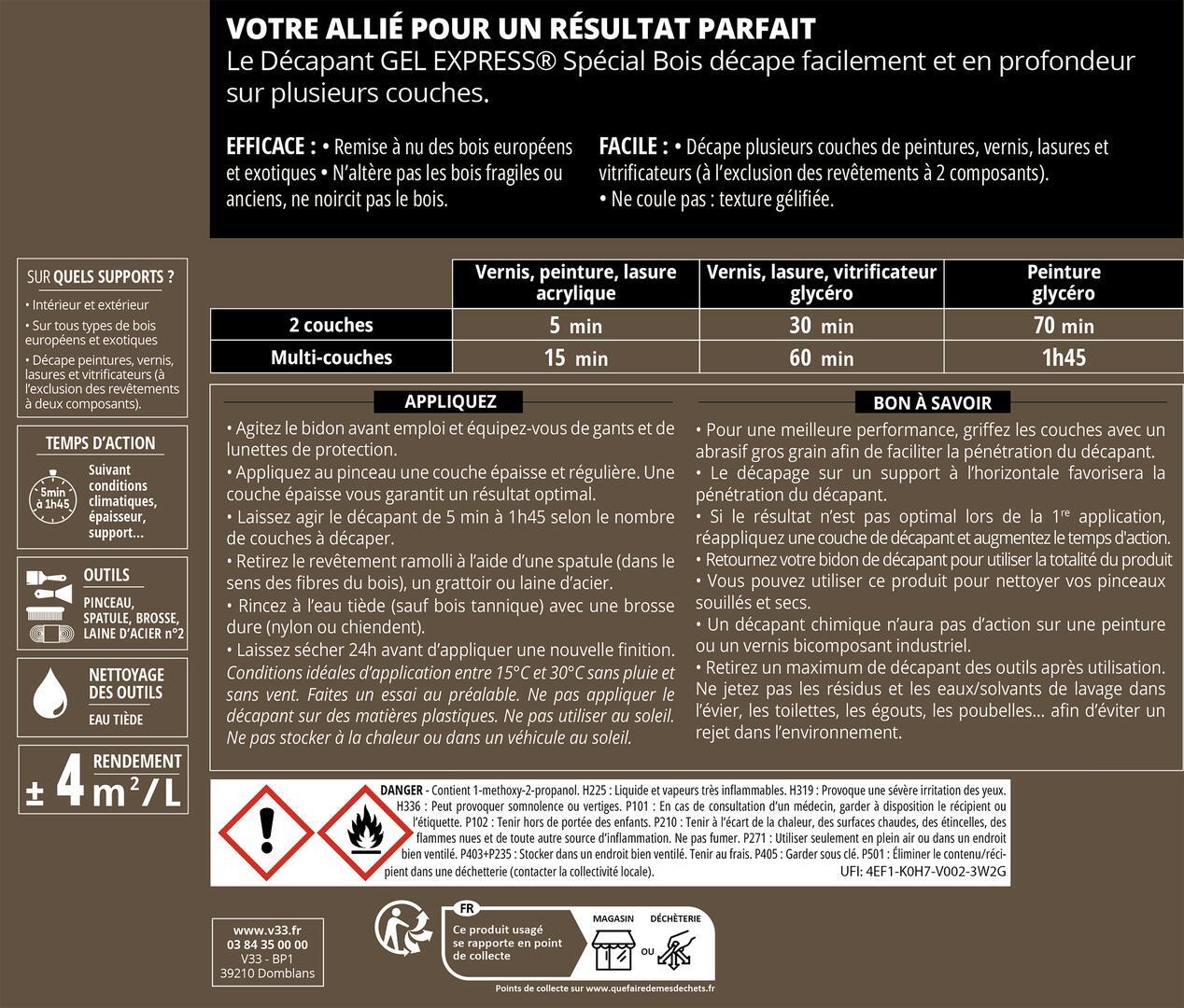 Il décape en profondeur les peintures, vernis, lasures et vitrificateurs (à l'exclusion des revêtements à 2 composants).